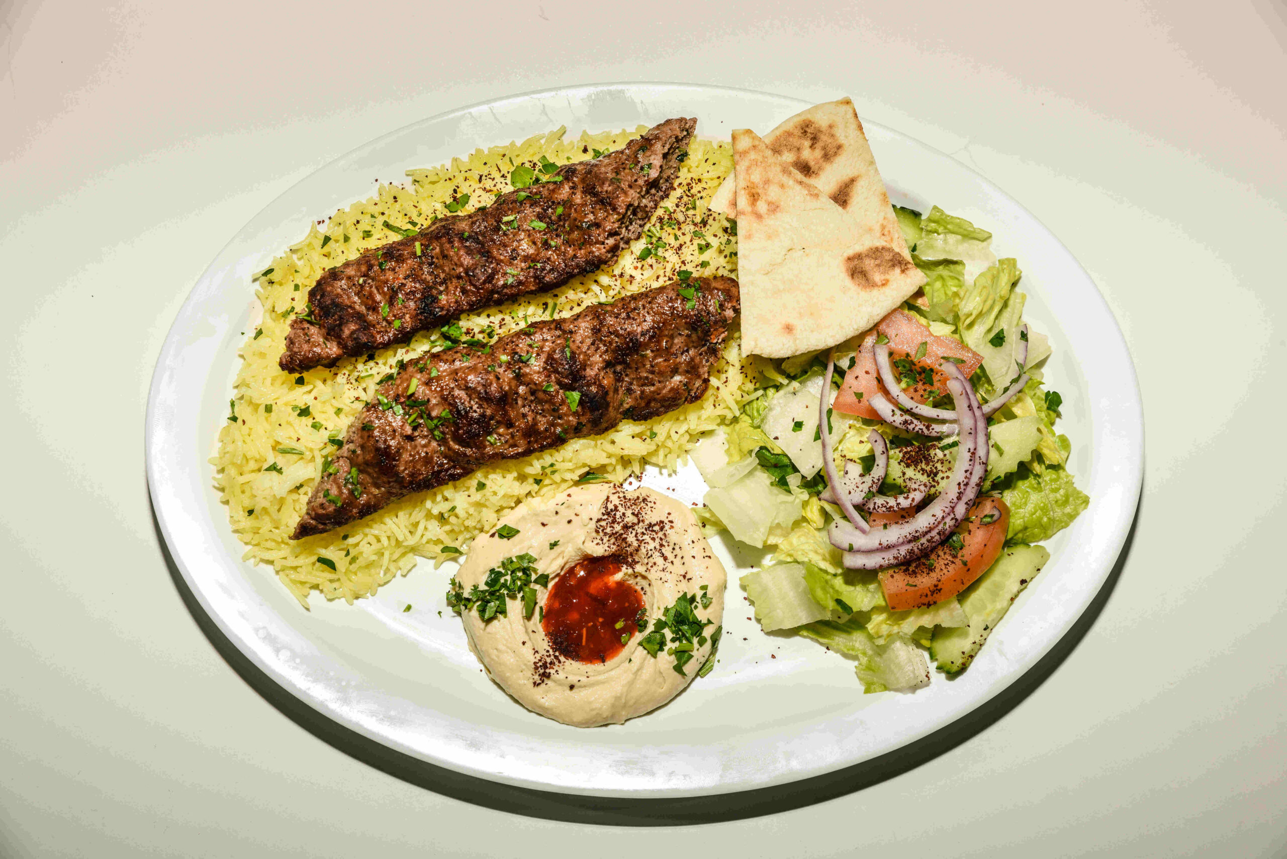 A skewer of seasoned ground beef and lamb, served with salad, hummus, pita bread and rice.