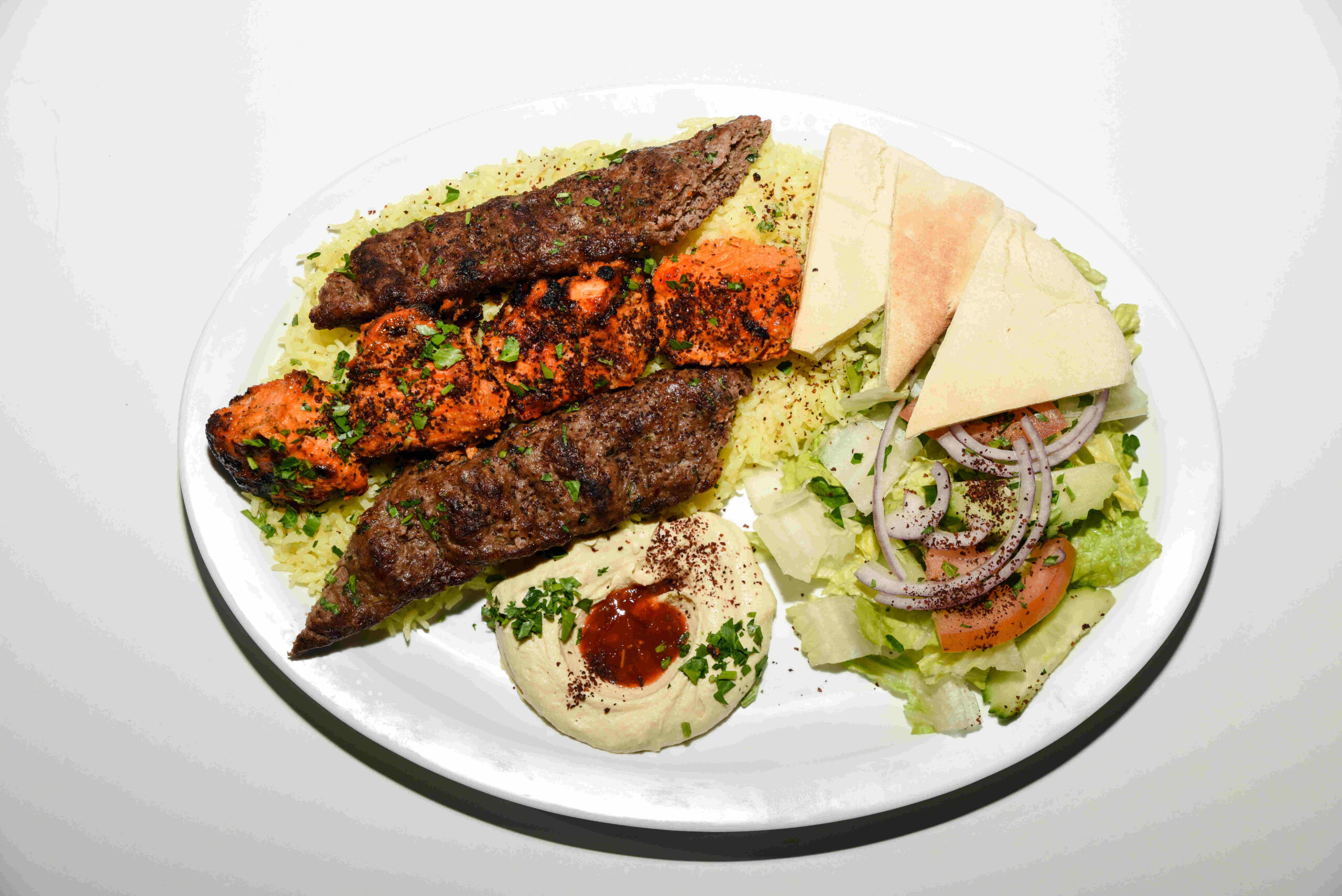 A skewer of seasoned ground lamb and beef and a skewer of marinated chicken cubes. Served with salad, hummus, pita bread and rice.